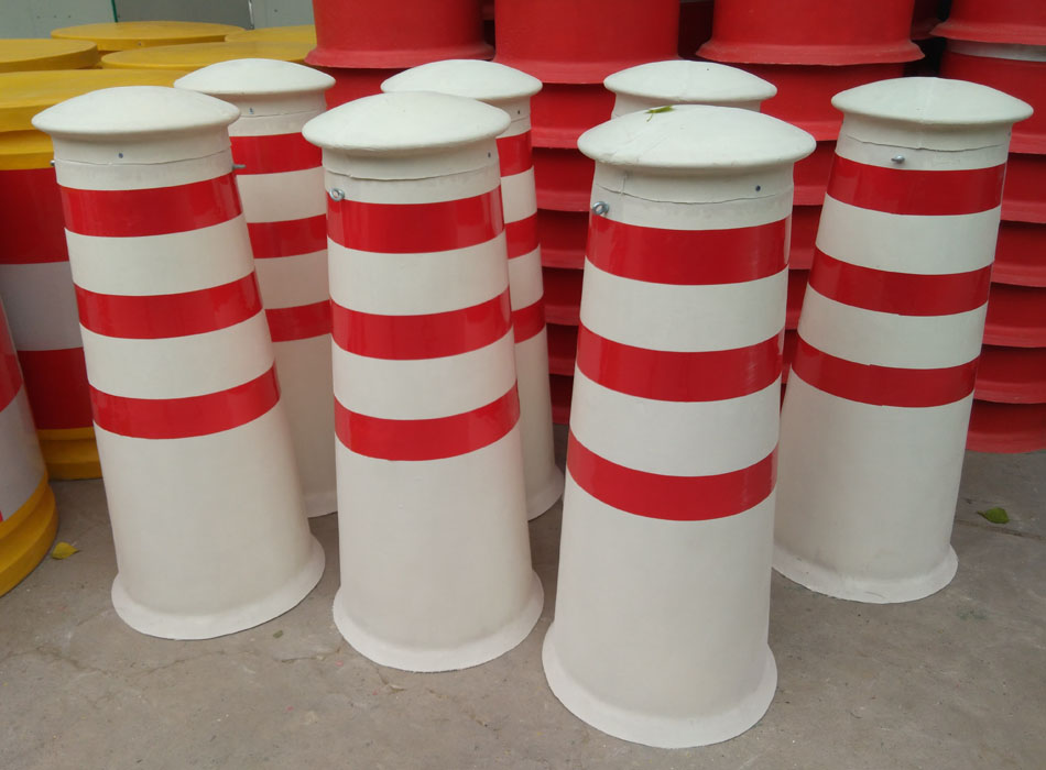 2防撞桶桶色為橘紅色,色澤鮮明亮麗,貼上紅白反光膜夜間更加醒目。