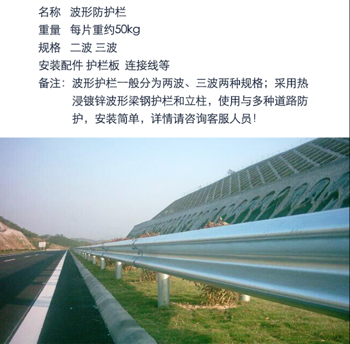 波形梁護欄產品介紹:常用路側波形梁護欄按防撞等級可分為B、A、SB、SA、SS五級,高速公路防撞護欄是典型的冷彎型鋼產品;二波護欄板常用規格是4320mm x 310mm x 85mm x3/4mm,立柱為:114/140 mmx 4.5mm:三波護欄板常用規格是 4320mm x 506mm x 85mm x 3/4mm,立柱為:130mm x 130mm x 6mm。